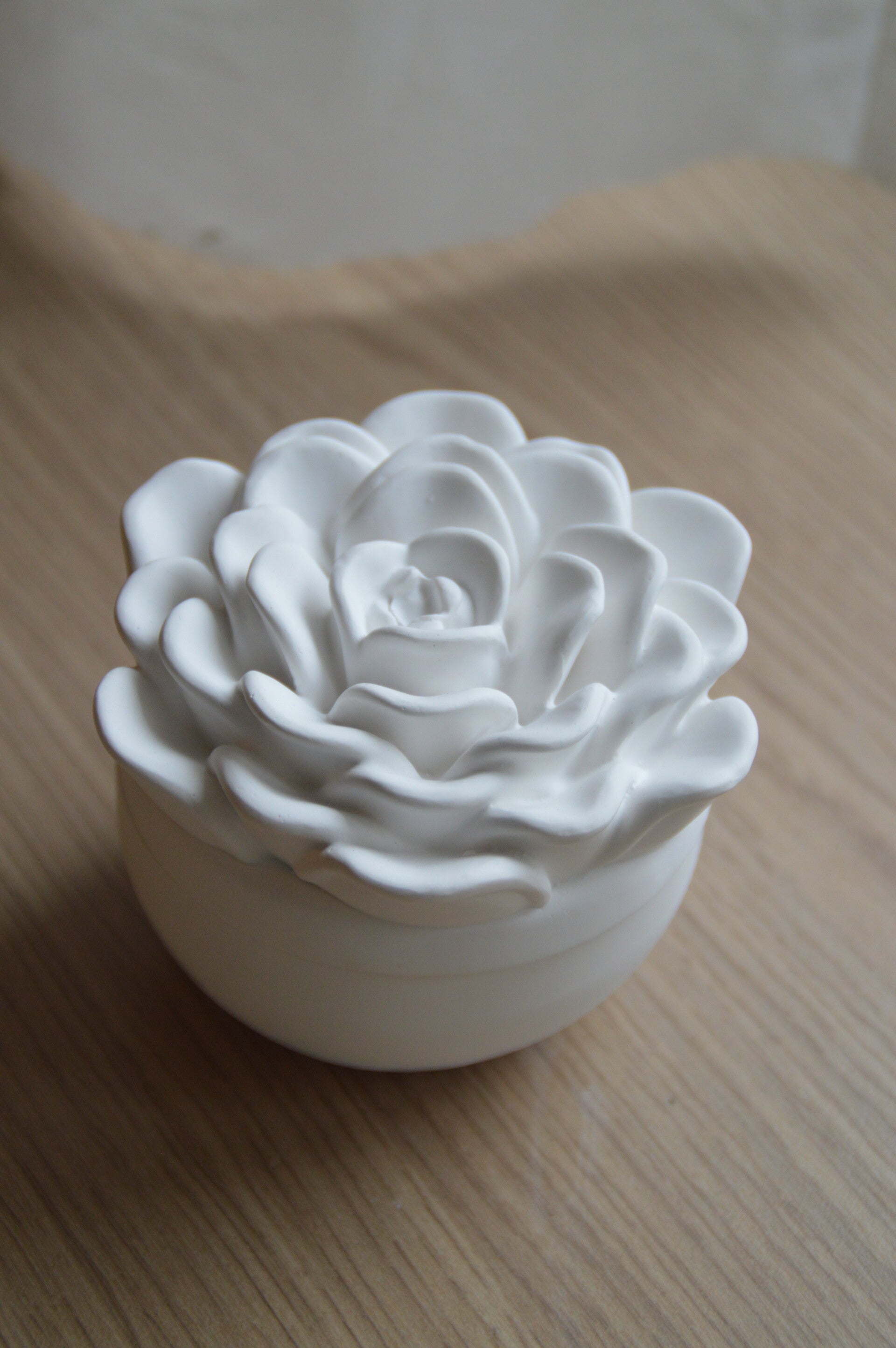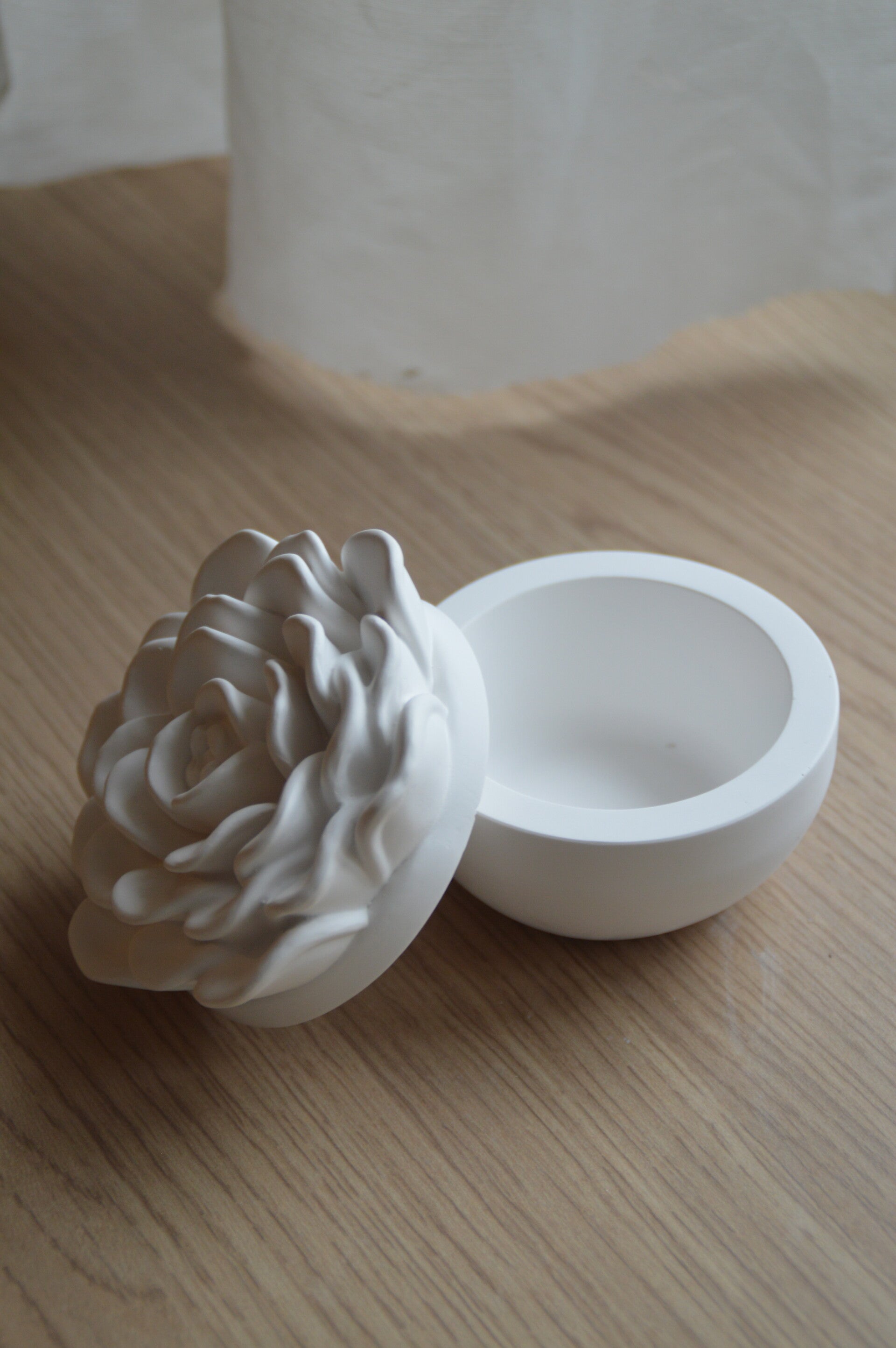 Son couvercle sculpté en forme de fleur aux pétales généreux et superposés apporte du relief et une élégance naturelle à la pièce.