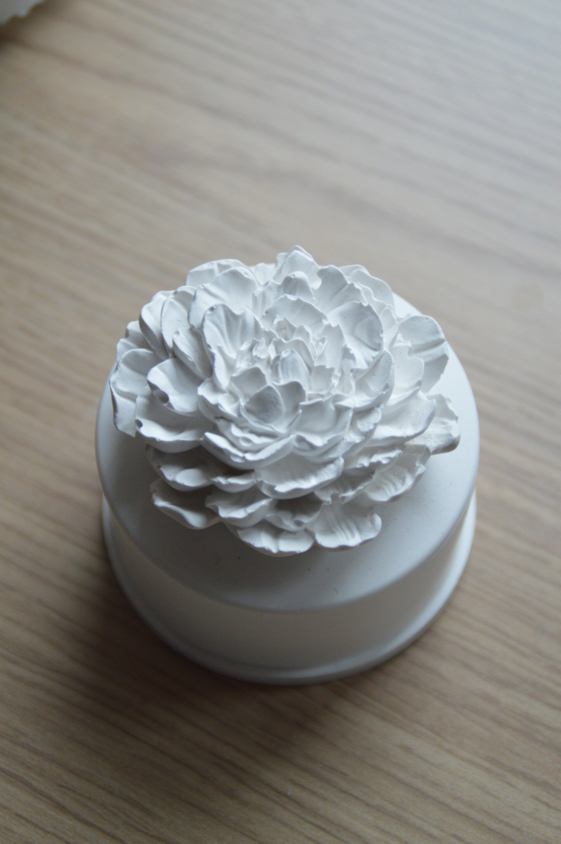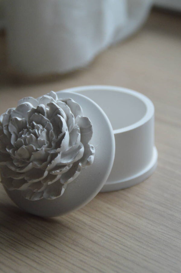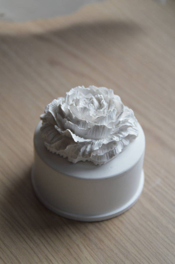 Son couvercle sculpté en forme de fleur apporte du relief et une élégance naturelle à la pièce.
