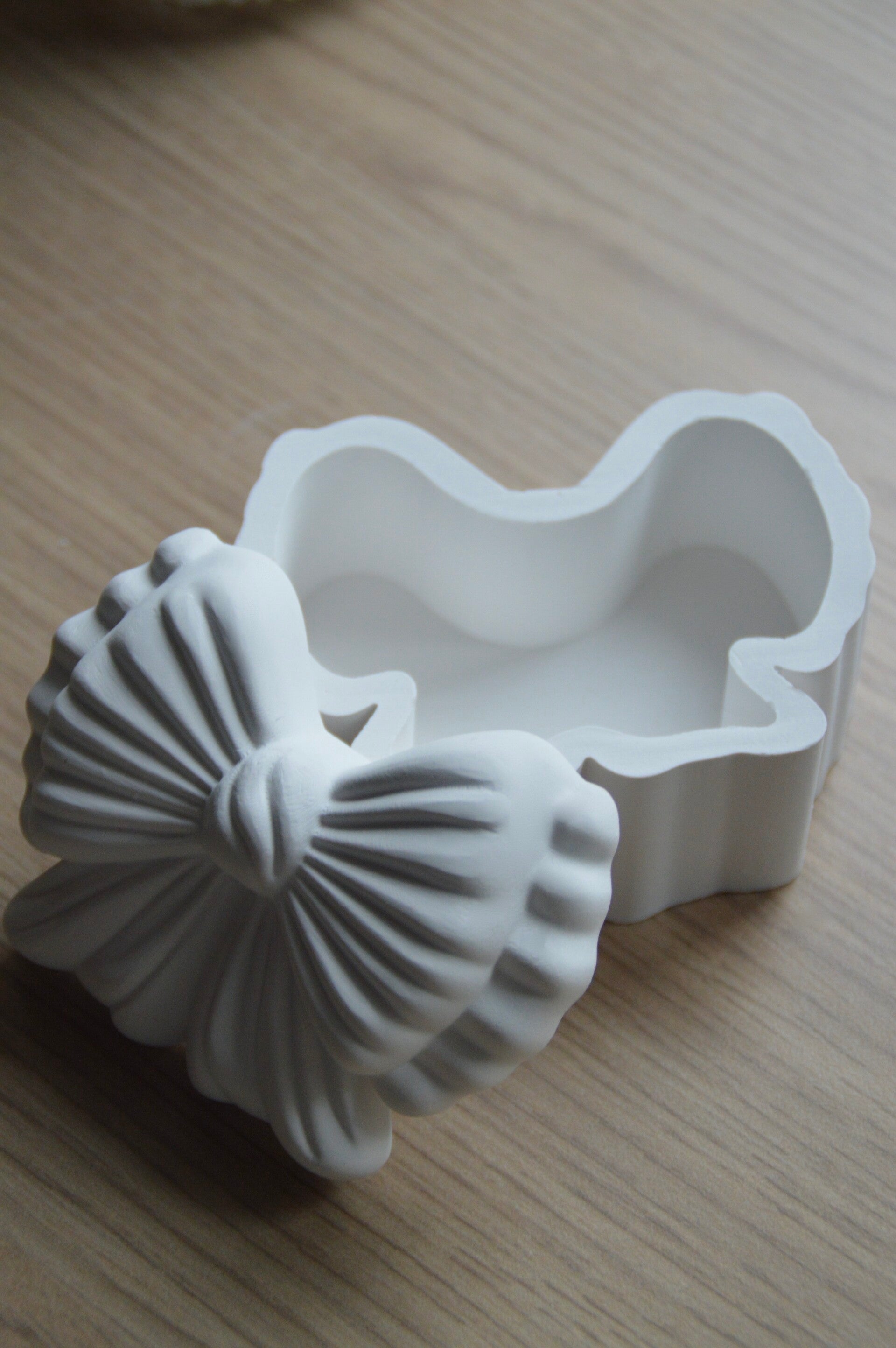 Tout en douceur et en finesse, cette boîte en forme de nœud évoque la délicatesse d’un ruban soigneusement noué.